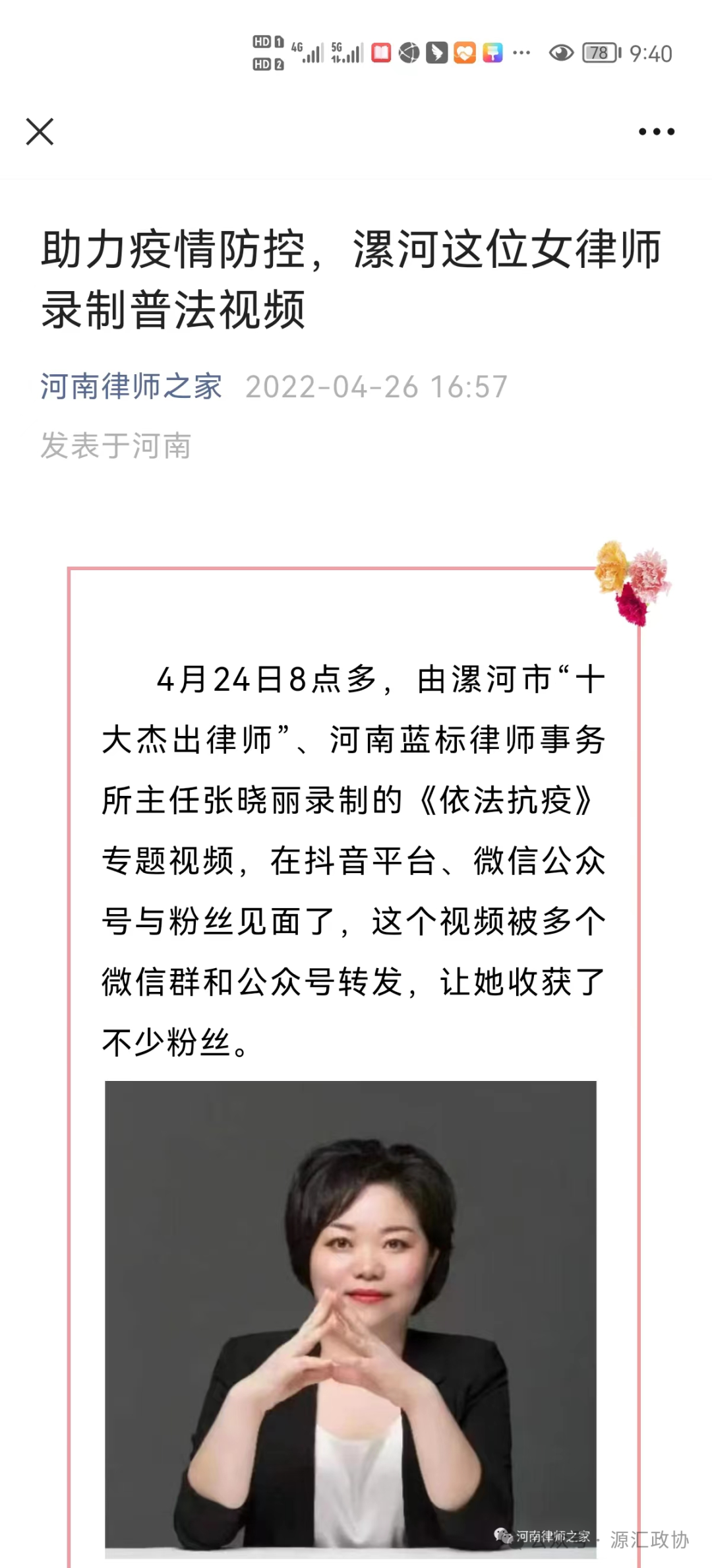 同时,张晓丽律师作为漯河律协公司法业务委员会主任,积极开展公司类培训交流活动,在提升办案能力的同时,用法律智慧帮助企业化解纠纷,用专业助力漯河经济发展,展示了漯河律师风貌。